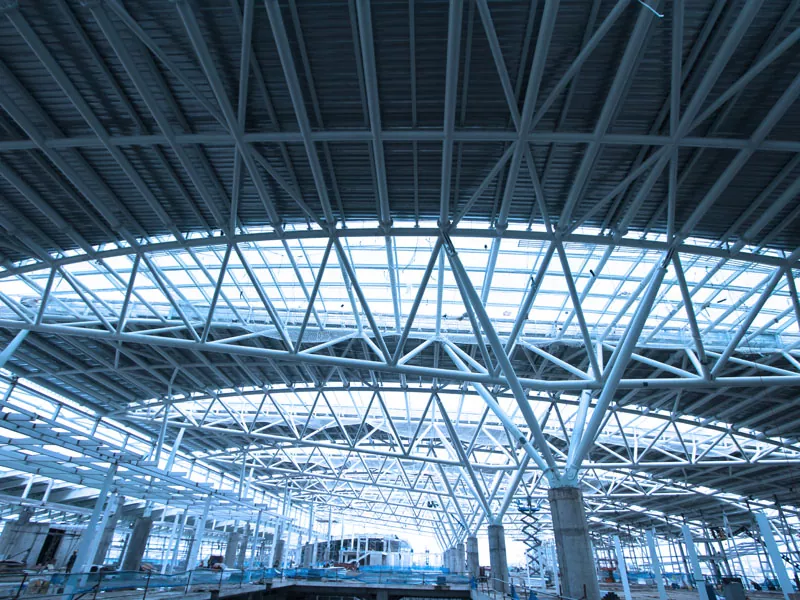 5. റൂഫിംഗും ബാഹ്യ ക്ലാഡിംഗും സ്റ്റീൽ ഫ്രെയിം പൂർത്തിയായിക്കഴിഞ്ഞാൽ, റൂഫിംഗ് സിസ്റ്റം ഇൻസ്റ്റാൾ ചെയ്യപ്പെടുന്നു, സാധാരണയായി ഇൻസുലേറ്റഡ് മെറ്റൽ പാനലുകൾ അല്ലെങ്കിൽ സിംഗിൾ-പ്ലൈ മെംബ്രൻ മെറ്റീരിയലുകൾ ഉപയോഗിക്കുന്നു. ബാഹ്യ മതിലുകൾ, ഡിസൈനിൽ ഉൾപ്പെടുത്തിയാൽ, മെറ്റൽ പാനലുകൾ, ഇഷ്ടികകൾ അല്ലെങ്കിൽ മറ്റ് ക്ലാഡിംഗ് വസ്തുക്കൾ എന്നിവ ഉപയോഗിച്ച് ഇൻസ്റ്റാൾ ചെയ്തിട്ടുണ്ട്.