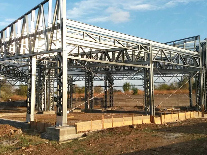 4. സ്റ്റീൽ സ്ട്രക്ചർ ഇൻസ്റ്റാളേഷൻ മുൻകൂട്ടി തയ്യാറാക്കിയ സ്റ്റീൽ ഘടകങ്ങൾ നിർമ്മാണ സ്ഥലത്തേക്ക് കൊണ്ടുപോകുകയും ക്രെയിനുകളും മറ്റ് കനത്ത ഉപകരണങ്ങളും ഉപയോഗിച്ച് കൂട്ടിച്ചേർക്കുകയും ചെയ്യുന്നു. ഫൗണ്ടേഷനിലേക്ക് നിരകൾ സ്ഥാപിക്കുകയും നങ്കൂരമിടുകയും ചെയ്തുകൊണ്ട് ഇൻസ്റ്റാളേഷൻ പ്രക്രിയ ആരംഭിക്കുന്നു, തുടർന്ന് വെയർഹൗസ് ഫ്രെയിം രൂപീകരിക്കുന്നതിന് ബീമുകൾ ഇൻസ്റ്റാൾ ചെയ്യുന്നു. റൂഫിംഗ് സിസ്റ്റത്തെ പിന്തുണയ്ക്കുന്നതിനായി റൂഫ് ട്രസ്സുകൾ ഉറപ്പിച്ചിരിക്കുന്നു.