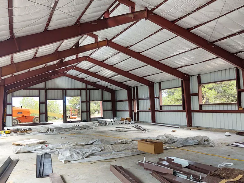 മേൽക്കൂരയും ബാഹ്യവുമായ ആഹ്വാനം:സ്റ്റീൽ ഫ്രെയിം പൂർത്തിയായാൽ, റൂഫിംഗ് സിസ്റ്റം ഇൻസ്റ്റാൾ ചെയ്തിട്ടുണ്ടെങ്കിൽ, സാധാരണയായി ഇൻസുലേറ്റഡ് മെറ്റൽ പാനലുകൾ അല്ലെങ്കിൽ സിംഗിൾ-പ്ലൈ മെംബ്രൺ മെറ്റീരിയലുകൾ ഉൾക്കൊള്ളുന്നു. ബാഹ്യ മതിലുകൾ, രൂപകൽപ്പനയിൽ ഉൾപ്പെടുത്തിയിട്ടുണ്ടെങ്കിൽ, മെറ്റൽ പാനലുകൾ അല്ലെങ്കിൽ ഇഷ്ടിക പോലുള്ള മെറ്റീരിയലുകൾ ഉപയോഗിച്ച് ഇൻസ്റ്റാൾ ചെയ്തിട്ടുണ്ട്.