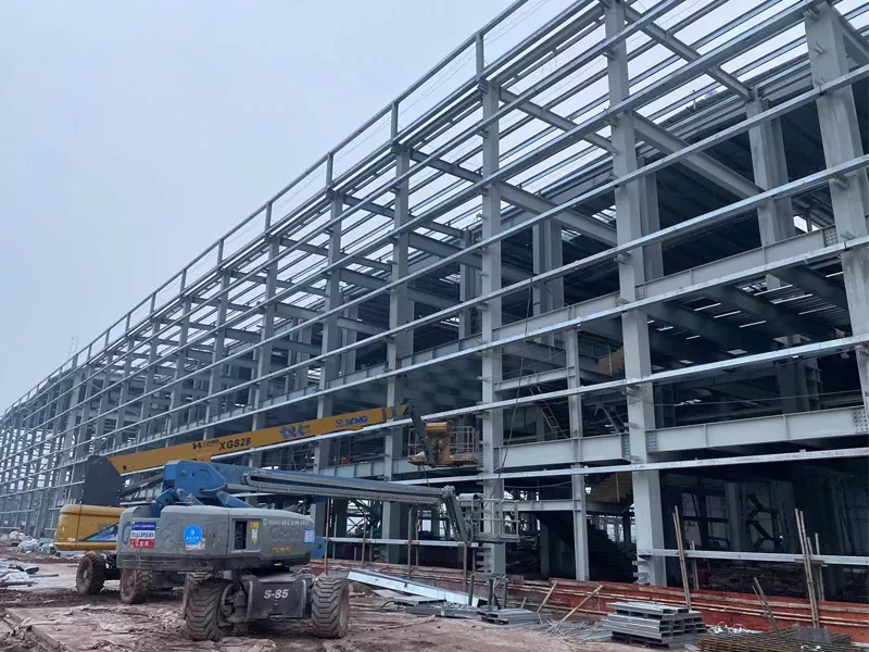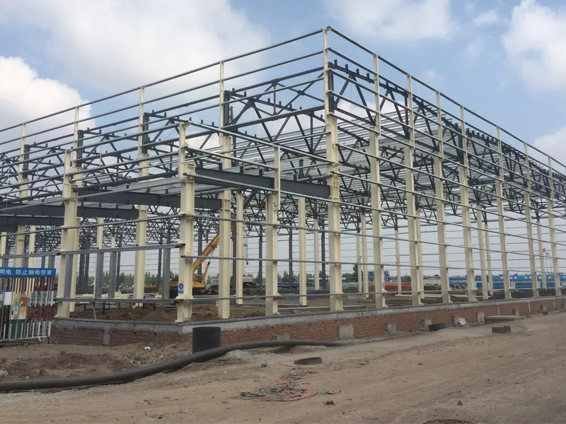 വർക്ക്ഷോപ്പിന്റെ ഉരുക്ക് ഫ്രെയിം സാധാരണ നിരകൾ, ബീമുകൾ, ബ്രേസുകൾ എന്നിവ ഉൾക്കൊള്ളുന്നു, അവ കർക്കശമായതും സ്ഥിരതയുള്ളതുമായ ഘടന രൂപീകരിക്കുന്നതിന് പരസ്പരം ബന്ധിപ്പിച്ചിരിക്കുന്നു. സ്റ്റീൽ അംഗങ്ങൾ പലപ്പോഴും ഒരു ഫാക്ടറിയിൽ മുൻകൂട്ടി നിശ്ചയിച്ചിട്ടുണ്ട്, തുടർന്ന് അസംബ്ലിക്കായി സൈറ്റിലേക്ക് കൊണ്ടുപോയി, നിർമ്മാണ സമയം ഗണ്യമായി കുറയ്ക്കുന്നു.
